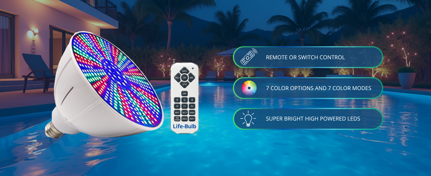 The Life-Bulb 120V Color LED Pool Light delivers the brightness of a 500W incandescent bulb using just 40W of power. Designed for easy installation in Hayward, Pentair, and other E26 screw-in fixtures, it features vibrant RGB color options controlled remotely to transform your pool ambiance. Backed by a lifetime replacement warranty, this energy-efficient, durable LED pool light is the ultimate upgrade for stylish, eco-conscious pool owners.